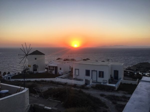 » After the sunset we got dinner and then stopped at a bar for drinks. When we walked out to the main square to catch the bus back to Fira, we realized we had missed the last one. Since we were going to have to pay for a taxi regardless, we decided to make the most of it and have another drink at the bar. After the one(ish) drink more, we went back out to the square only to find out all the taxies were now gone for the night.